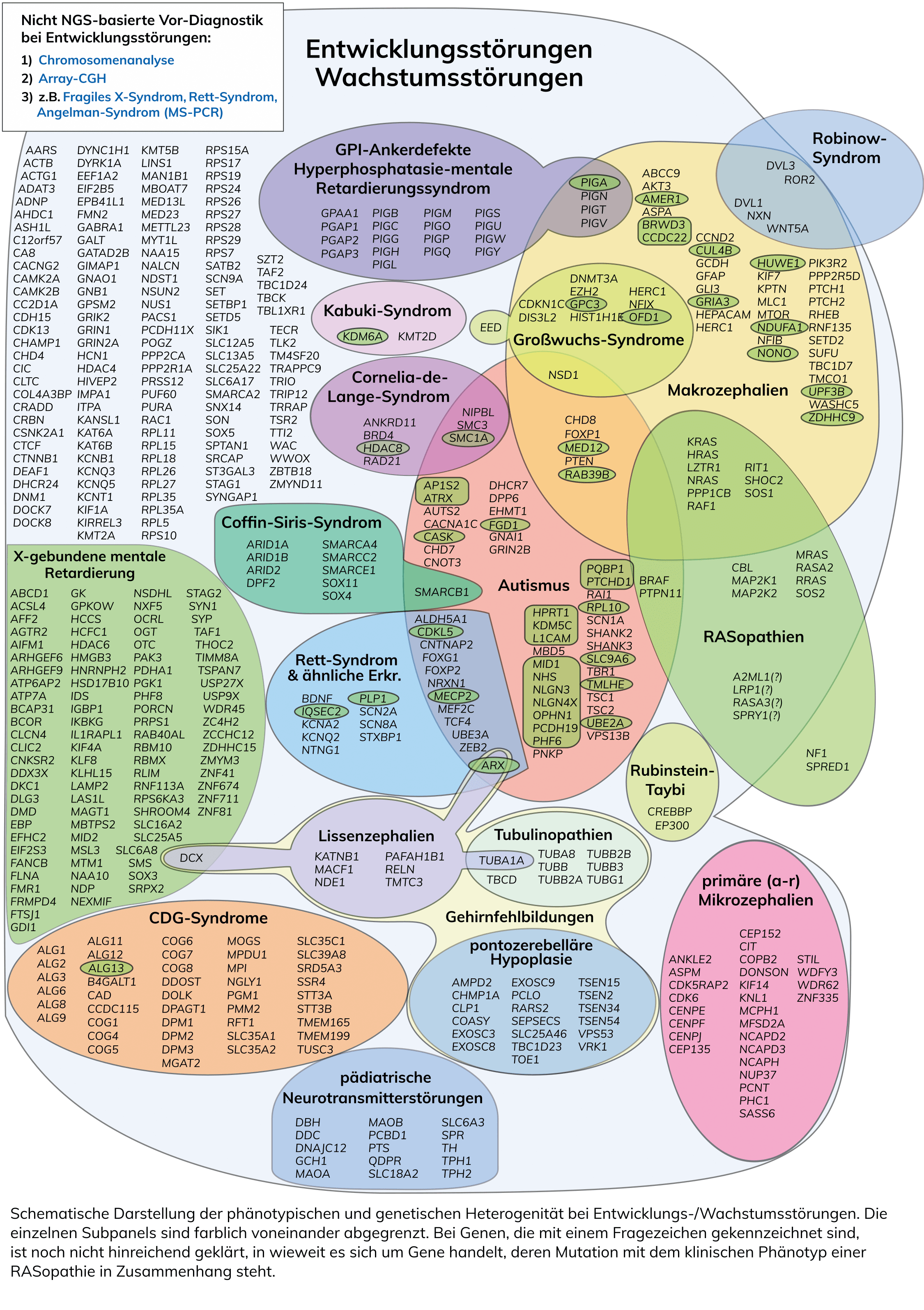 Bei einer Reihe von Entwicklungsstörungen stehen auch andere Symptome im Vordergrund, so z. B. Autismus-Spektrum-Störungen oder auffällige Wachstumsparameter, z. B. Makrozephalie, Mikrozephalie oder Großwuchs. Darüber hinaus gibt es syndromale Formen von Entwicklungsstörungen, bei denen differenzialdiagnostisch weitere Syndrome und damit weitere ursächliche Gene in Frage kommen (z.B. Rett- und Rett-ähnliche-Syndrome). Schließlich sind hier auch einige der bekannteren, genetisch heterogenen Syndrome aufgeführt, die sinnvoll mittels NGS untersucht werden können (Cornelia-de-Lange-Syndrom, RASopathien u.a.).