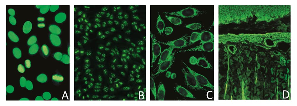 A ANA, homogenes Muster (AC-1); B ANA, Zentromere (AC-3); C AMA (AC-21); D ASMA (AC-15) (Bilder: EUROIMMUN AG).