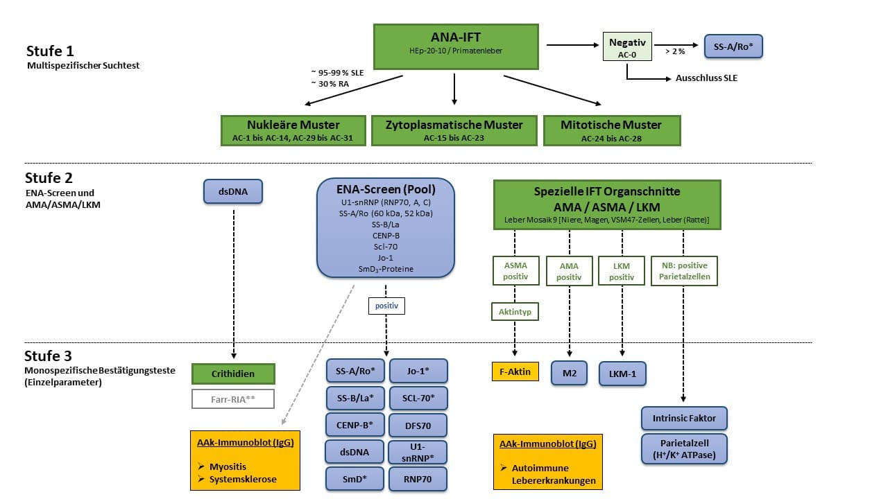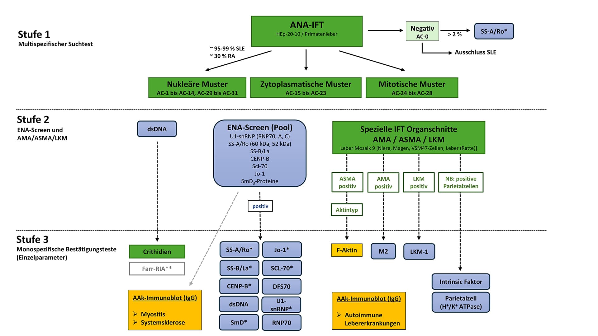 Die Stufendiagnostik (s. Abbildung 1) bei Verdacht auf eine systemische Autoimmunerkrankung beginnt mit der Bestimmung von Autoantikörpern (AAk) gegen Zellkerne, auch ANA (antinukleäre Antikörper) genannt. Die AAk Bestimmung gegen intrazelluläre Strukturen (Kern und Zytoplasma) wird mittels indirekter Immunfluoreszenztechnik (IFT) auf Objektträgern mit fixiertem mitotisch aktivem Zellmaterial (HEp-2 Zellen und Primatenleberzellen) durchgeführt. Die Antikörper im Patientenserum binden dabei spezifisch an ihre intrazelluläre Zielstruktur und werden mittels fluoreszenzmarkiertem Anti-human IgG sichtbar gemacht. Bei positivem Test (Titer ≥1:100 Erwachsene;≥1:32 bei Kindern bis 17 Jahre) wird eine Untersuchung mit serieller Verdünnung des Patientenserums (Austitrierung bis Titer 1:10.000) angeschlossen.