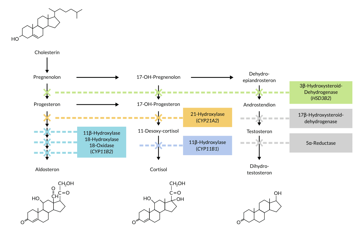 Zudem kann die Analyse der Gene CYP11B2 (Aldosterone-Synthase), HSD3B2 (3β-Hydroxysteroid-Dehydrogenase), CYP17A1 (Steroid-17α-Hydroxylase), STAR* (Steroid Acute Regulatory Protein), POR*(Cytochrom P450 Oxidoreduktase) und CYP11A2* (Cholesterol-Monooxygenase) durchgeführt werden.