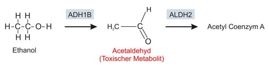 Die genetisch bedingte Alkohol-Intoleranz kommt vorwiegend in den asiatischen Bevölkerungsruppen vor. Die Variante p.Arg48His im ADH1B-Gen (ADH1B*2-Allel) und p.Glu504Lys im ALDH2-Gen (ALDH2*2-Allel ) ist mit einer erhöhten Alkohol-Sensitivität assoziiert und wird im Rahmen der Routinediagnostik untersucht.