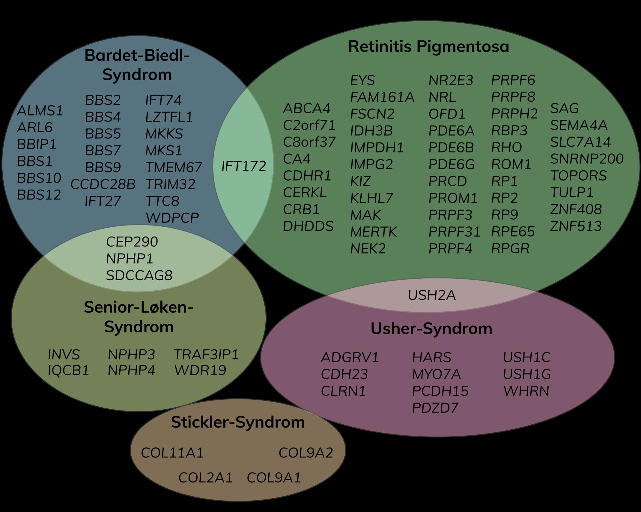 Genetisch bedingte Augenerkrankungen umfassen eine Vielzahl von Störungen, die durch pathogene Varianten in verschiedensten Genen verursacht werden und oft zu progressivem Sehverlust führen. Zum Beispiel führt das Bardet-Biedl-Syndrom neben anderen Symptomen auch zu Retinitis pigmentosa, einer degenerativen Erkrankung der Netzhaut. Beim Usher-Syndrom tritt Retinitis pigmentosa mit Hörverlust auf, während das Stickler– und Wagner-Syndrom strukturelle Veränderungen im Auge bewirken, die zu Netzhautablösung und anderen Sehproblemen führen können. Das Senior-Løken-Syndrom ist durch eine Nephronophthise und Retinitis pigmentosa charakterisiert, die zu Nierenversagen und Sehverlust führen.