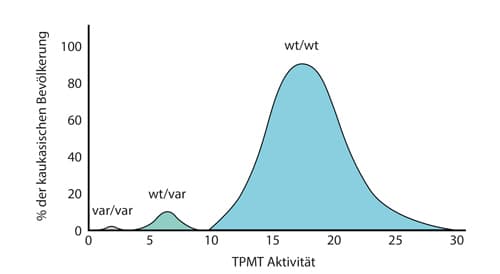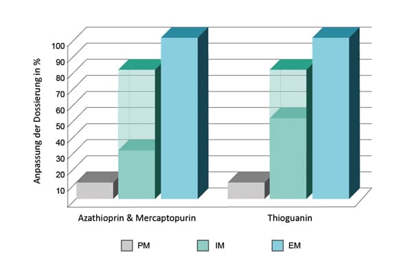 Das Enzym Thiopurin-S-Methyltransferase ist am Abbau von Thiopurinen wie Azathioprin, beteiligt. Pathogene Varianten im TPMT-Gen führen zu einer Enzymdefizienz und einer Akkumulation von Thioguanin-Nukleotiden im hämatopoetischen Gewebe, wodurch eine schwere Myelosuppression mit potenziell tödlichem Ausgang enstehen kann. Durch die Bestimmung des TPMT-Genotyps kann eine individuellen Dosisanpassung erfolgen und medikamentöse Nebenwirkungen vermieden werden.