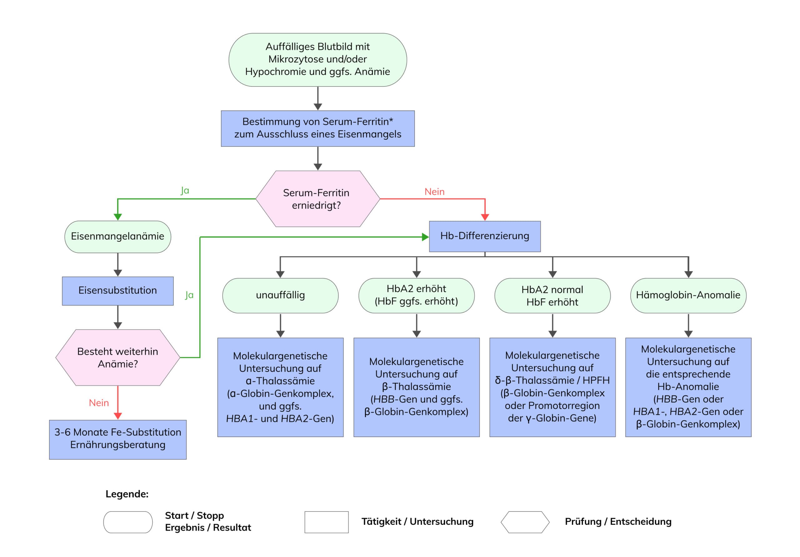 Bei der Diagnostik von Hämoglobinopathien ist zu beachten, dass diese in den verschiedensten Kombinationen auftreten können. Daher sollten die hämatologischen Befunde (Blutbild, Hb-Differenzierung, Eisenstatus) immer mit den Ergebnissen aus der Molekulargenetik abgeglichen werden.