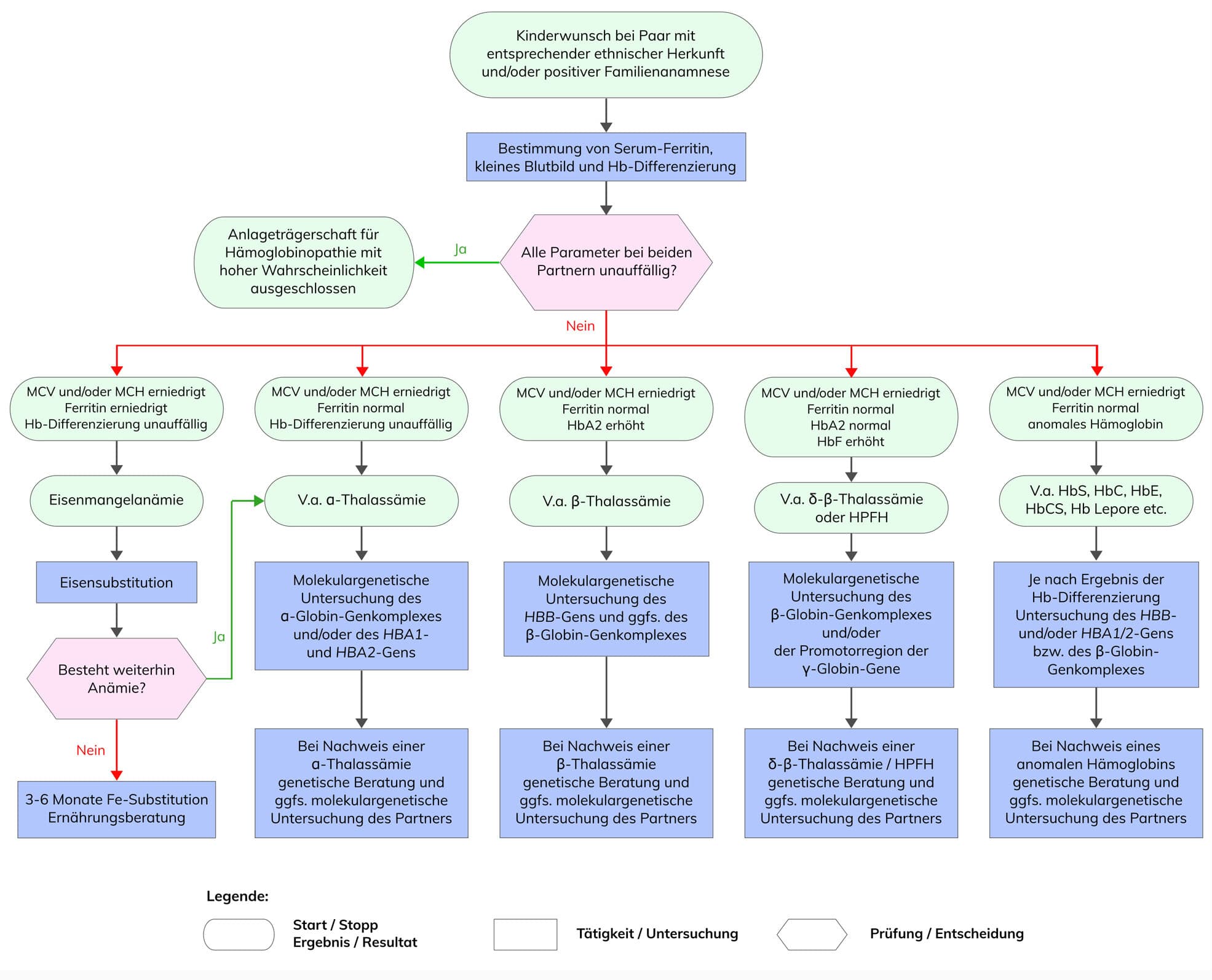 Die detaillierte diagnostische Vorgehensweise zur allgemeinen Diagnostik von Hämoglobinopathien und zur Vorgehensweise bei Paaren mit Kinderwunsch ist in den folgenden Flussdiagrammen dargestellt.