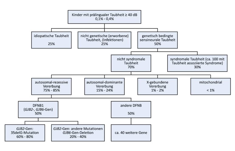 Die kongenitale sensorineurale Taubheit wird in der Literatur mit einer Inzidenz von 1-4 von 1000 beziffert. Der Anteil genetisch bedingter sensorineuraler Taubheit beträgt 50%. 70% der genetisch bedingten Taubheit ist nicht-syndromal und 30% syndromal. 80% der nicht-syndromischen Fälle werden autosomal-rezessiv vererbt. Pathogene Varianten im GJB2-Gen sind in bis zu 50% aller autosomal-rezessiven und in bis zu 35% der sporadischen Fälle von Taubheit ursächlich. Das Genprodukt, Connexin26, ist ein essentieller Bestandteil der Gap-Junctions und somit an der Ausbildung der Zell-Zell-Verbindung beteiligt. Die häufigste pathogene Variante im GJB2-Gen, die Deletion eines Guanins (35delG), führt zum funktionellen Verlust eines Allels. Sie ist in ca. 60-80% der mutanten Allele nachweisbar und kommt in der Gesamtbevölkerung mit einer Allelfrequenz von ca. 1% vor.