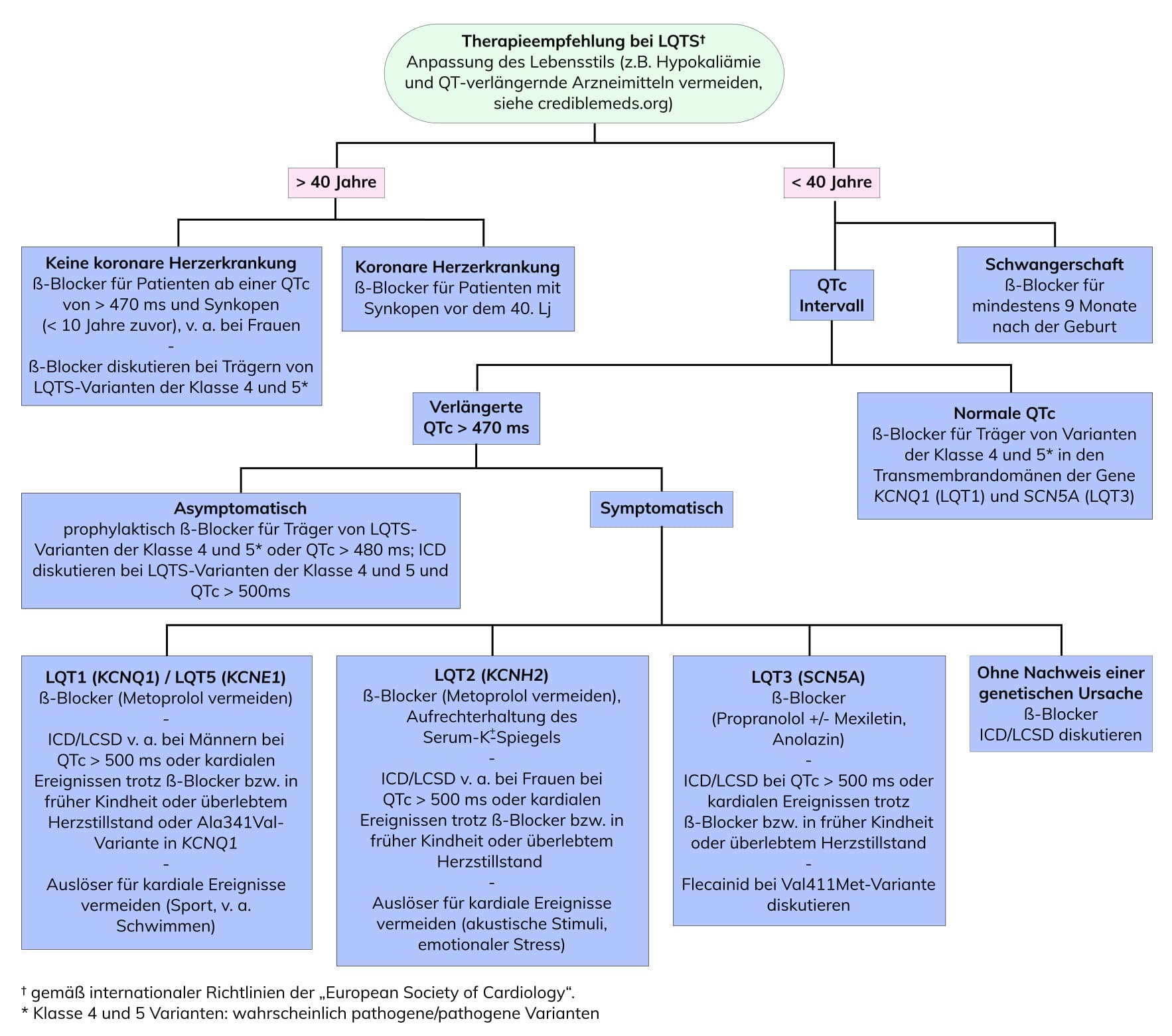Die Identifikation von Anlageträgern pathogener Varianten ermöglicht eine rechtzeitige, ggfs. präsymptomatische Therapie. Das Risiko für kardiale Ereignisse wird dadurch beim LQTS Typ 1 um 62-95% und beim LQTS Typ 2 um 74% reduziert. Gemäß internationaler Leitlinien sollten alle LQTS-Patienten ab dem Zeitpunkt der Diagnose den Lebensstil anpassen (z.B. die Vermeidung von QT-verlängernden Arzneimitteln, siehe crediblemeds.org) und mit β-Blockern behandelt werden. Die Implantation eines ICD wird bei therapierefraktären rezidivierenden Synkopen / ventrikulären Tachykardien, einem vorangegangenen Herzstillstand oder bei LQT2-Patienten mit einer QTc von >500 ms empfohlen.