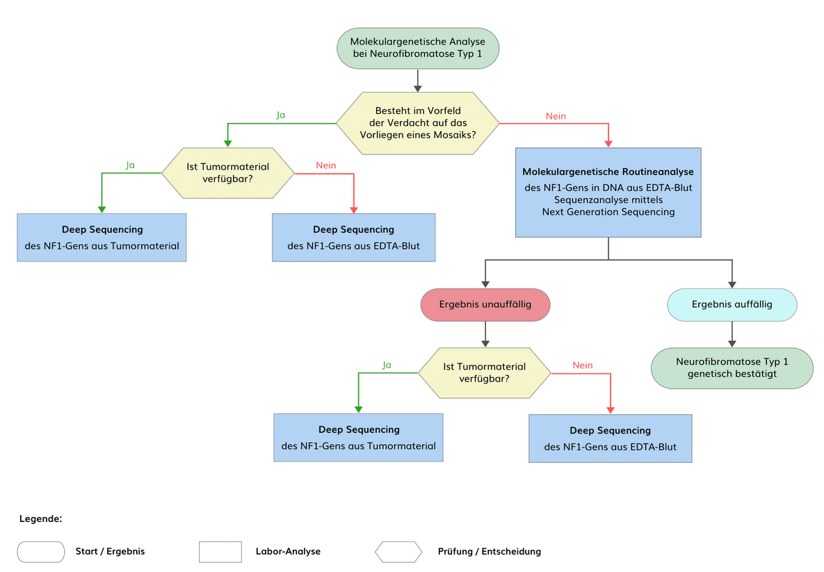 Mit einer Kombination mehrerer Analysetechniken, die eine Sequenzanalyse der codierenden Regionen, eine Deletions-/Duplikationsanalyse und eine cDNA-Analyse beinhalten, können bei mehr als 95% der Patienten, bei denen die diagnostischen Kriterien des NIH Consensus Development Conference Statement für Neurofibromatose Typ 1 (NF1) erfüllt sind, pathogene Varianten im NF1-Gen nachgewiesen werden. Insbesondere cDNA-Analysen sind allerdings nicht Bestandteil der Routinediagnostik.