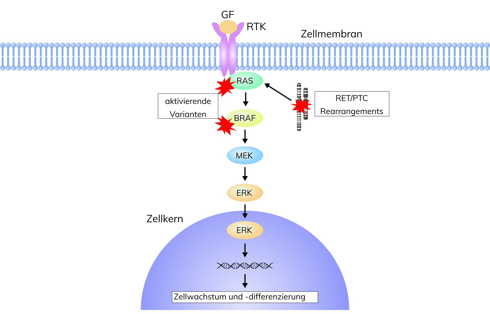 Das papilläre Schilddrüsenkarzinom(PTC) stellt mit ca. 65-80% die mit Abstand häufigste Entität innerhalb der epithelialen Schilddrüsenkarzinome dar. Es ist molekulargenetisch charakterisiert durch chromosomale Rearrangements unter Einbezug des RET-Gens (RET/PTC-Rearrangements oder RET-Fusionsgene) sowie pathogene Varianten innerhalb der RAS– oder BRAF–Protoonkogene, die letztlich alle zu einer pathologischen Aktivierung des MAPK-Signalwegs (Abb.) führen. Varianten im BRAF– (Val600Glu, Lys601Glu), NRAS– (Codon 12, 13 und 61), HRAS– oder RET-Gen finden sich in nahezu 70% aller Fälle von PTC. Tumoren mit Varianten in BRAF sind häufiger undifferenziert und mit aggressiveren Tumoreigenschaften wie z.B. schlechterem Ansprechen auf eine radioaktive Jodtherapie assoziiert. BRAF Val600Glu findet sich in 45-59% der PTC, vorrangig in der klassisch papillären und großzelligen Variante und in bis zu 80% der Patienten mit rezidivierendem oder metastasierendem PTC. PTC mit Varianten in NRAS, HRAS und KRAS sind häufiger differenziert und finden sich in 10-20% der follikulären Variante des PTC. Dabei finden sich pathogene Varianten in BRAF und RAS nahezu nie gemeinsam in PTC-Tumoren. In bis zu 10% aller PTC werden zudem pathogene Varianten im TERT-Promotor (Cys288Thr; Cys250Thr) gefunden. Sie sind mit einem schlechteren klinischen Outcome assoziiert, insbesondere in Kombination mit BRAF-Varianten.