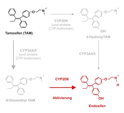 Der Wirkstoff Tamoxifen ist ein Prodrug, das im Körper in den ebenfalls aktiven Metaboliten Endoxifen umgewandelt wird. Dabei spielt das polymorphe Enzym CYP2D6 eine wichtige Rolle. Klinische Daten deuten darauf hin, dass Polymorphismen im CYP2D6-Gen, die zu einer herabgesetzten CYP2D6-Aktivität führen, mit einer Wirkungsbeeinträchtigung der Tamoxifentherapie einhergehen können. Dies gilt in besonderem Maße für die Homozygotie von nicht-funktionellen CYP2D6-Allelen (Poor Metabolizer Phänotyp). Bei Patientinnen mit fehlender CYP2D6-Aktivität wurden deutlich erniedrigte Spiegel des wirksamen Metboliten Endoxifen nachgewiesen. Hinweise zum Zusammenhang zwischen CYP2D6-Genotyp und dem Endoxifenspiegel sind auch in die Fachinformation von Tamoxifen aufgenommen. Mittlerweile können Dosis- und Therapieempfehlungen für Tamoxifen im Kontext zum CYP2D6-Genotyp den verschiedenen Guidelines für Tamoxifen und CYP2D6 entnommen werden. Es ist darüber hinaus schon lange bekannt, dass die parallele Einnahme von CYP2D6-Inhibitoren (z.B. Paroxetin) zu Tamoxifen als Folge der Arneimittelinteraktion zu herabgesetzten Endoxifenspiegeln führt.