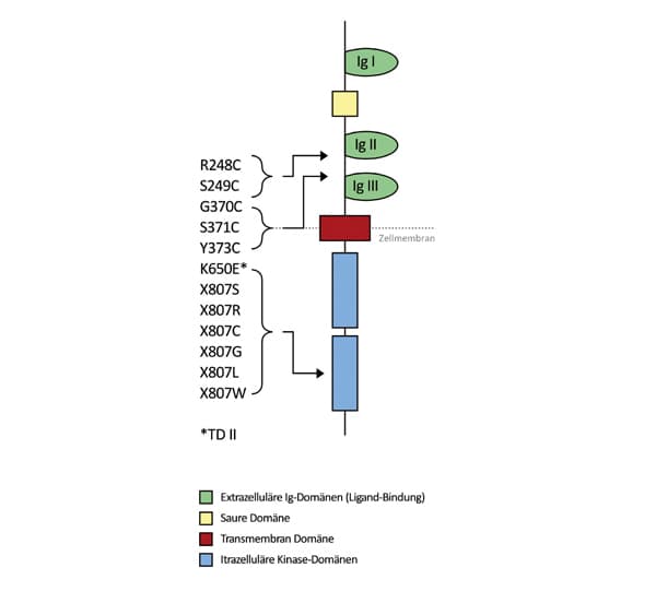 Abb.: Schematische Darstellung der Domänen des FGFR3-Proteins, der Verankerung des Proteins in der Zellmembran und die Lokalisation der Mutationen im Protein (modifiziert nach Hilbert et al. 1998, Monatsschr Kinderheilkd 146:687)