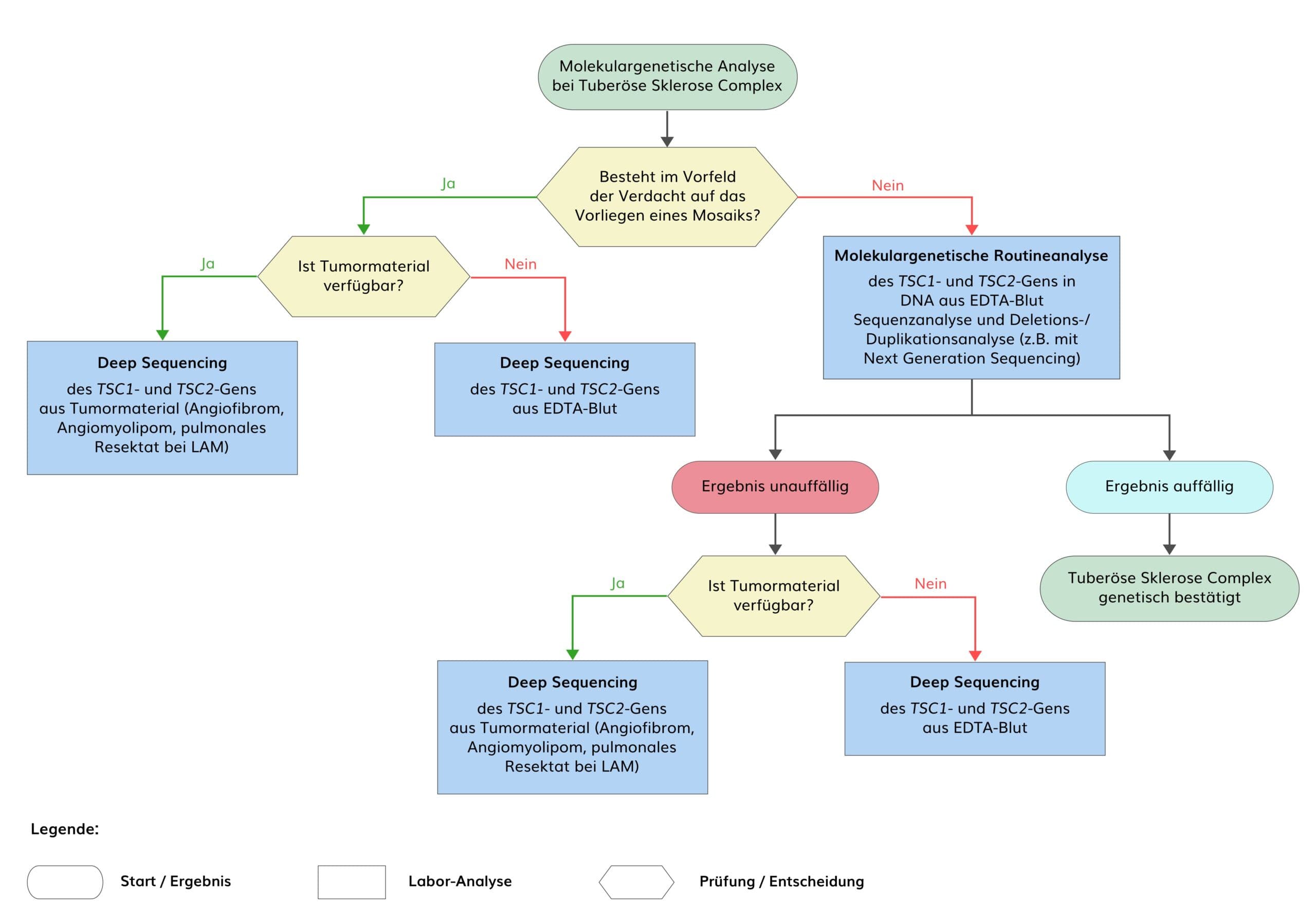 Die genetische Analyse beider TSC-Gene mittels Sequenzierung erfasst ca. 90% aller bisher bekannten Nukleotidveränderungen. Bis zu 10% der pathogenen Varianten in beiden TSC-Genen sind größere genomische Deletionen und Duplikationen. Bei etwa 85% aller Patienten mit der klinisch gesicherten Diagnose TSC kann durch die Kombination von Sequenzanalyse der codierenden Regionen und zusätzlicher Deletions-/Duplikationsdiagnostik eine pathogene Variante in einem der beiden TSC-Gene detektiert werden. Bei etwa 50% der mit dieser Methodik molekulargenetisch nicht aufzuklärenden Fälle können mittlerweile pathogene Varianten in Form von Mosaiken oder in regulatorischen Regionen mit Hilfe von Next Generation Sequencing mit einer Sequenziertiefe von mind. 1000-fach (NGS; Deep Sequencing) der gesamten genomischen Regionen beider TSC-Gene detektiert werden.