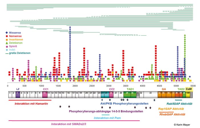 Die Tuberöse Sklerose (TSC) ist eine autosomal-dominant vererbte Multisystemerkrankung mit variabler klinischer Symptomatik. Ursächlich sind pathogene Varianten in den TSC1- und TSC2-Genen, die als Tumorsuppressorgene fungieren. Diese Gene wirken auf zellulärer Ebene rezessiv, d.h., sie führen nur dann zur lokalen Entstehung von Hamartomen, wenn durch zwei unabhängige Varianten beide homologen TSC-Gene inaktiviert wurden. Infolge von pathogenen TSC1- oder TSC2-Varianten kommt es zur Überaktivierung der mTOR-Signaltransduktion und zu einer verstärkten Proliferation in den charakteristischen TSC-Läsionen.