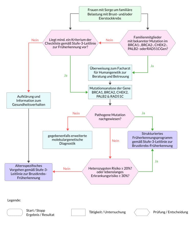 In Deutschland sind ca. 30% aller Krebserkrankungen bei Frauen Mammakarzinome und 3,3% Ovarialkarzinome, wobei ein signifikanter Anteil erblich bedingt ist. Die genetische Diagnostik ist indiziert, wenn bestimmte Kriterien des Deutschen Konsortiums Familiärer Brust- und Eierstockkrebs erfüllt sind. Es wird die Untersuchung von 13 Genen empfohlen, unter denen häufig pathogene Varianten in den Genen BRCA1 und BRCA2 nachgewiesen werden, die das Risiko für Brust- und Eierstockkrebs signifikant erhöhen. Bei identifizierten Trägerinnen von pathogenen Varianten sind intensivierte Vorsorgeuntersuchungen und präventive Maßnahmen indiziert.