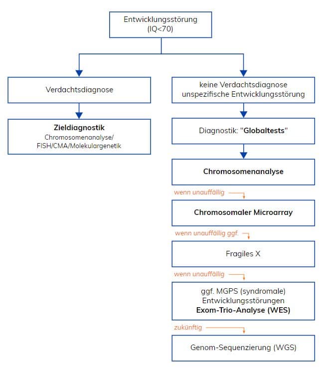Derzeit erfolgt die Abklärung einer nicht-syndromalen Entwicklungsstörung als Stufendiagnostik mit Chromosomenanalyse und, bei unauffälligen Befund, mit chromosomalem Microarray (CMA). Ggf. kann noch eine molekulargenetische Untersuchung, z.B. zum Ausschluß eines Fragilen X-Syndroms oder Angelman-Syndroms erfolgen.