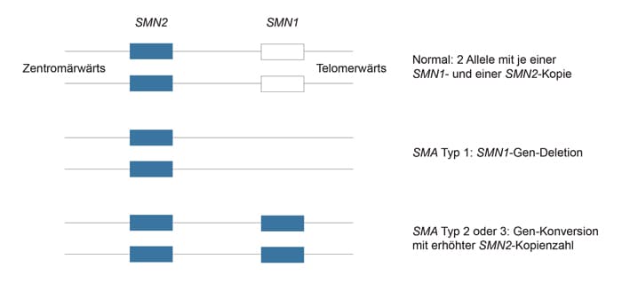 Mehr als 95% der Patienten tragen eine homozygote Deletion des Exons 7 und/oder 8 des SMN1-Gens, unabhängig vom klinischen Typ. Ein kleinerer Anteil der Patienten trägt auf einem Allel die o.g. Deletion, auf dem anderen eine Punktmutation (zusammengesetzt heterozygot). Der fehlende Nachweis des SMN1-Gens kann auch auf einer Gen-Konversion von SMN1 zu SMN2 beruhen, womit die Anzahl der Kopien des SMN2-Gens steigt. Da man so eine Gen-Konversion und eine gesteigerte Anzahl von SMN2-Kopien eher bei SMA II und III findet, wird angenommen, dass SMN2 den SMN1-Verlust teilweise kompensieren kann. Diese Erkenntnis wird verstärkt zur Entwicklung von Therapiekonzepten zur Behandlung der SMA verwendet, z.B. werden Medikamente wie Valproinsäure, Phenylbutyrat u.a. getestet, die in vitro die SMN2-Funktionsfähigkeit erhöhen.