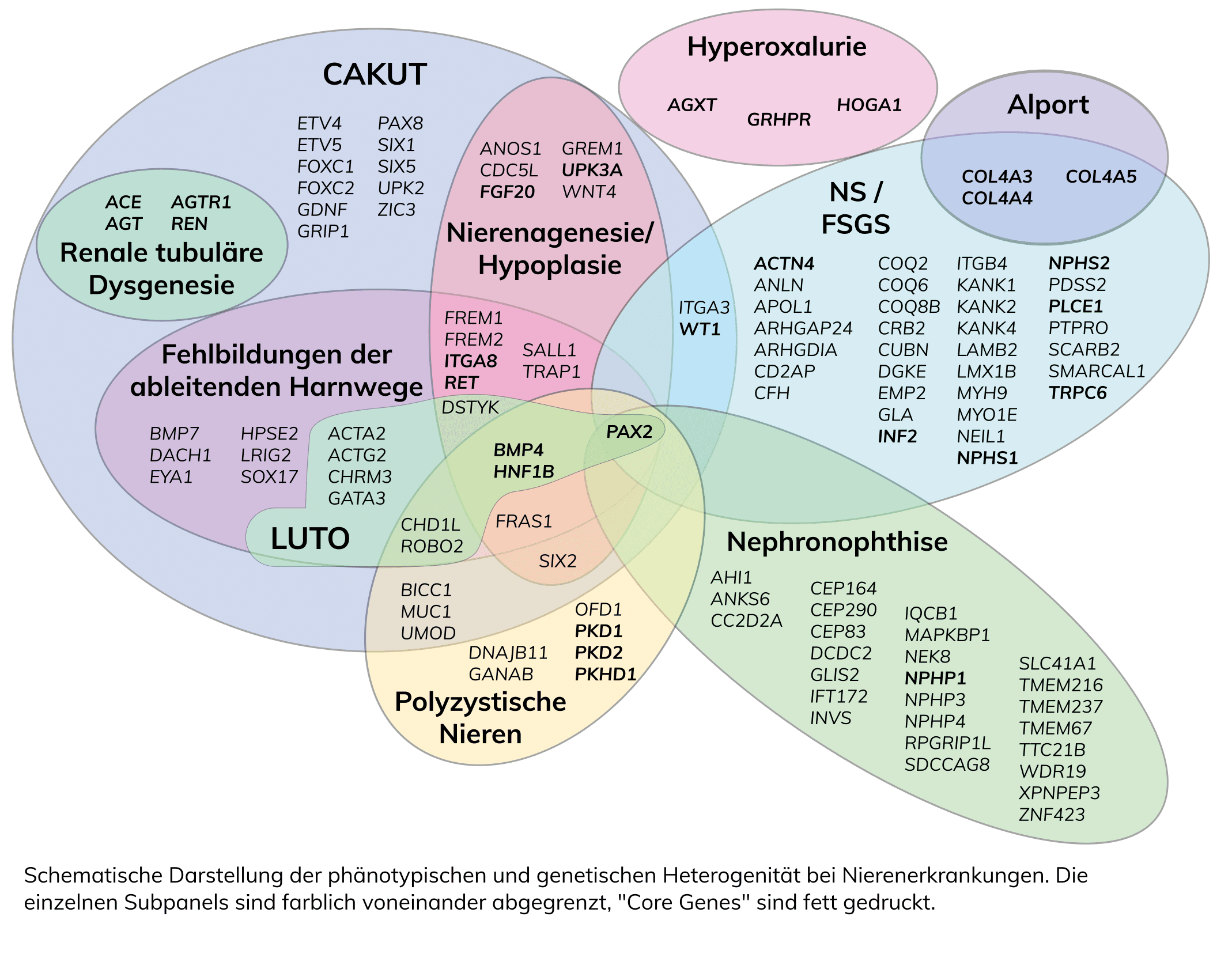 Genetische Ursachen angeborener Nierenerkrankungen sind vielfältig, mit verschiedensten Krankheitsbildern mit sehr großer klinischer und genetischer Heterogenität. Die molekulargenetische Diagnostik zur Diagnosefindung oder Bestätigung ist oft entscheidend für die Beratung betroffener Familien und zum Teil auch für die Therapie der Patienten. Mittels Next Generation Sequencing (NGS) können viele mit angeborenen Nierenerkrankungen assoziierte Gene auf einmal untersucht werden (Gen-Panel Diagnostik). Dies ist besonders bei klinisch schwer abzugrenzenden Phänotypen, aber auch bei großer intrafamiliärer Variabilität der Ausprägung von Fehlbildungen von großem Vorteil. Eine molekulargenetische Abklärung mittels NGS kann die exakte Zuordnung erleichtern, zur Identifikation modifizierender genetischer Faktoren beitragen und die Therapie und damit die Prognose der betroffenen Patienten verbessern.