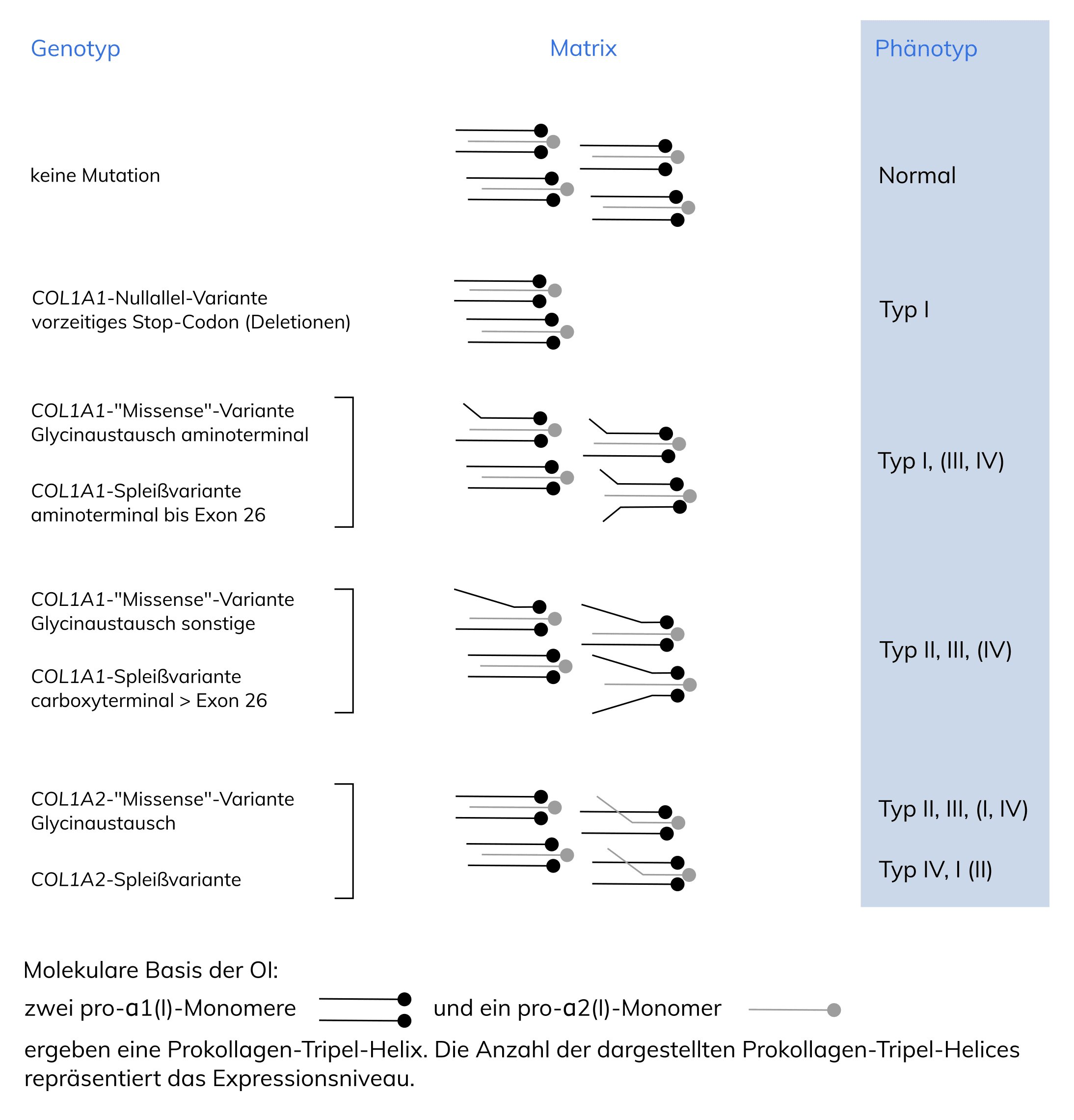 OI oder Glasknochenkrankheit (Häufigkeit etwa 1:10.000) ist eine klinisch und genetisch heterogene Gruppe von Erkrankungen mit erhöhter Knochenbrüchigkeit, die, abgesehen von sehr seltenen Sonderformen, autosomal-dominant vererbt werden. In 97% der OI-Typ I-Fälle und 77% der moderat bis schweren Formen können ursächliche Varianten in den COL1A1– und COL1A2-Genen nachgewiesen werden. Häufig führen diese zur Substitution von Glycin in der Tripel-Helix-Domäne des Typ I-Kollagens. In ca. 9% der moderat bis schweren Fälle sind Varianten im IFITM5-Gen ursächlich. Die klinische Symptomatik hängt vom betroffenen Gen sowie von Art und Lokalisation der Variante ab (Genotyp-Phänotyp-Korrelation).
